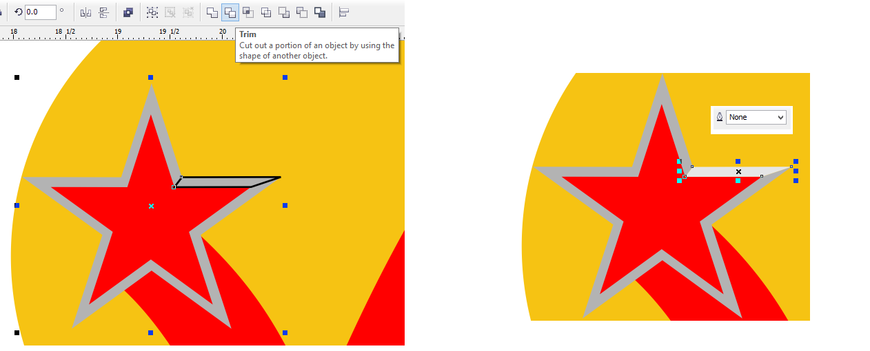 Tiếp theo chọn hình vừa vẽ và hình ngôi sao ngoài, sử dụng lệnh Trim để cắt hình. Tô màu xám trắng hình vừa được cắt và chọn chế độ không đường viền ta được như hình sau: